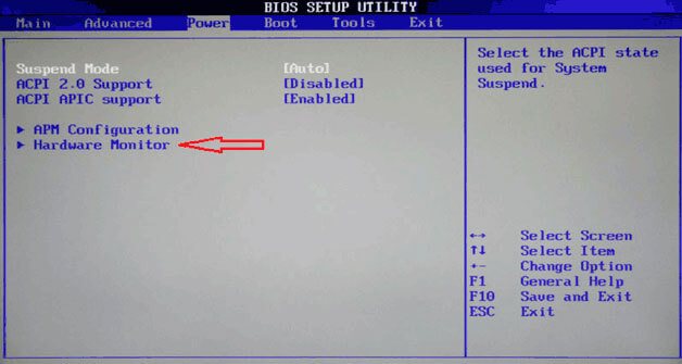 - Далее переходим во вкладку «Power», а затем отправляемся в подраздел «Hardware Monitor»;